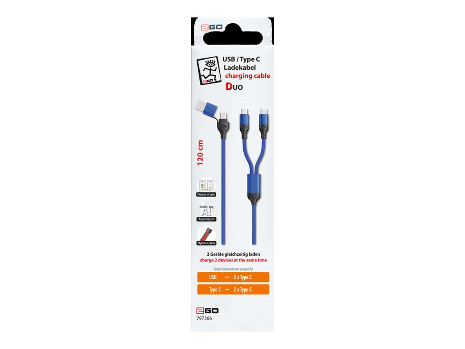 2GO USB / USB-C Ladekabel Duo USB-C, blau, 1,2m