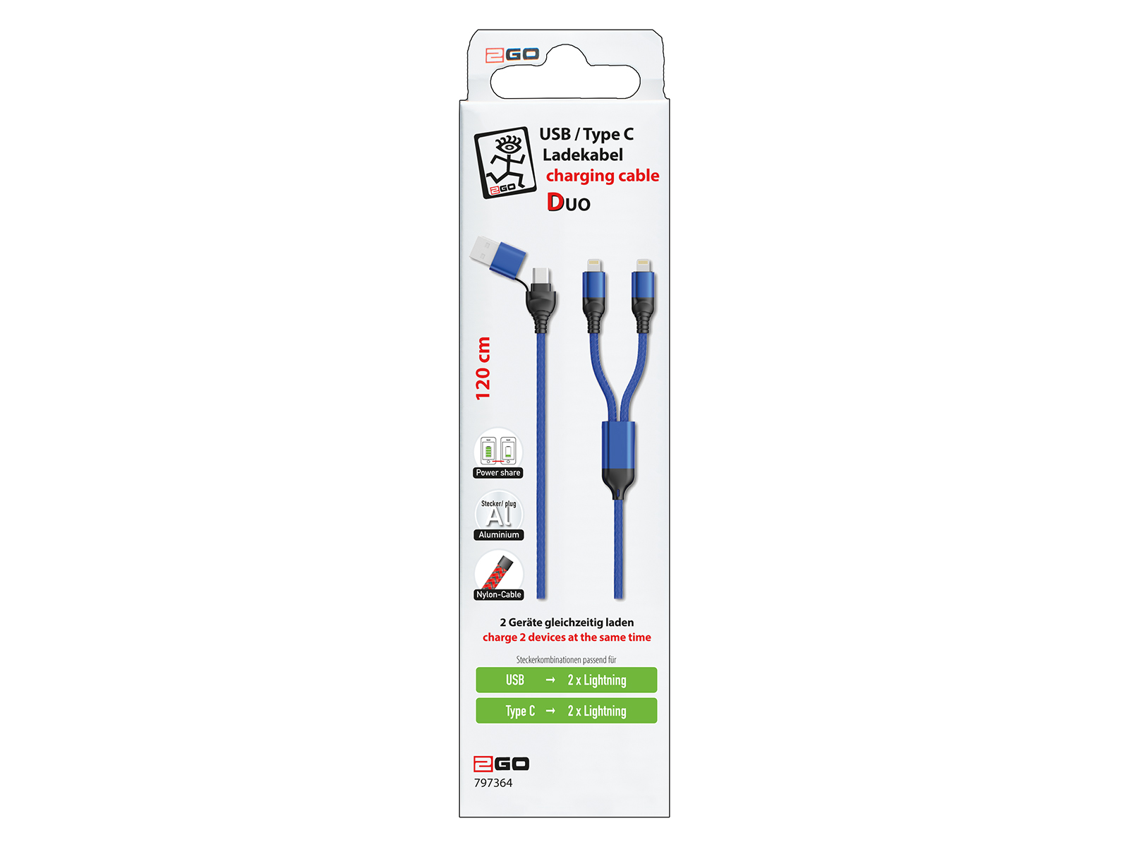Weiterführende Links zu "2GO USB / USB-C Ladekabel Duo USB-C, blau, 1,2m"